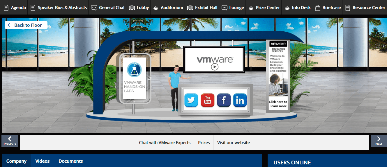 VMware vendors had booths in the event’s Exhibit Hall that were fully customized to reflect branding, alongside selected businesses also benefiting from their logos displayed prominently in the event Lobby. The booths were staffed with company representatives to ensure open communication via audio, text and video chat capabilities that vFairs offers.
